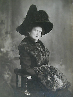 Antique RPPC Real Photo Postcard~Lovely Lady~Winter Fur Muff~Large Feather Hat