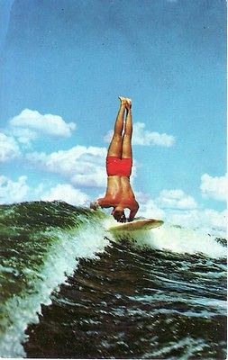 Title (ebay affiliate link): 1950s-1960s Vintage SURFING Postcard~SURFER Standing on Head~Lewes, DE~Chrome