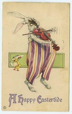 Title (ebay affiliate link): Happy Eastertide Stecher Upright Dressed Rabbit Playing Violin Chick Wearing Hat