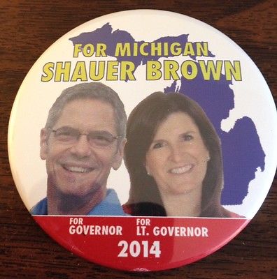 Title (ebay affiliate link): For Michigan, Shauer for Governor/Brown for Lt. Governor 2014 Pinback Button