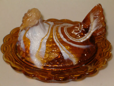 AMBER & MILK SLAG GLASS HEN CHICKEN ON NEST BASKET DISH