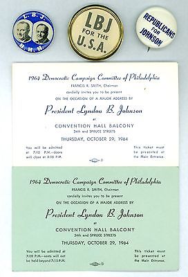 3 Vintage 1964 President Johnson Political Pinback Buttons Flicker & 2 Tickets