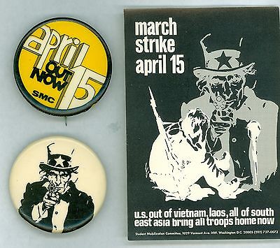 2 Vintage 1960s Out Now April US Out Vietnam Pinbacks Uncle Sam & US Out Sticker