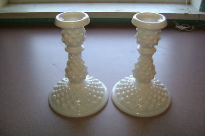 Pair of Fenton Milk Glass Hobnail Candle Sticks