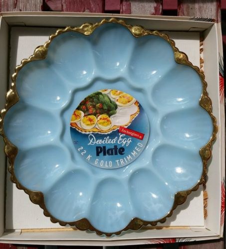 Title (ebay affiliate link): Anchor Hocking #896 Delphite Blue Milk Glass 22K gold trim Deviled Egg Plate