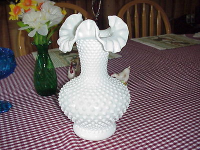 Title (ebay affiliate link): Vintage Fenton Art Glass HOBNAIL Milk Glass Ruffled, Double Crimped 10.5" Vase