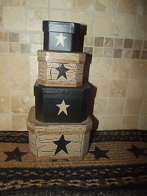 Primitive Crackle Nesting Boxes Set of 4 ~ Black & Tan Stars Country Decor