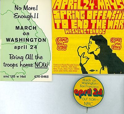 Vintage 1960s 70s anti-Vietnam War March April 24 Pinback & 2 Anti-War Handbills