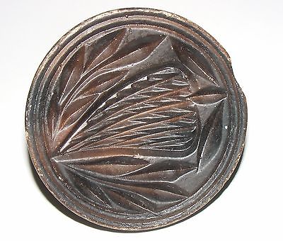 Rare Unique Old Primitive Round Wood Carved BUTTER Mold Stamp Press Print Brown