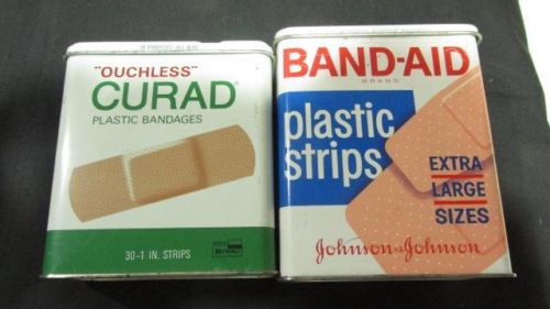2 BANDAGES TOP HINGE TINS * OUCHLESS CURAD * BAND-AID PLASTIC STRIPS