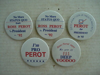Title (ebay affiliate link): 5 DIFFERENT RARE ROSS PEROT PRESIDENTIAL 1992 ELECTION PINS 2 1/4" DIAMETER