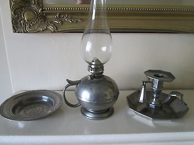 antique oil lamp chamber stick and 1769 marked dish