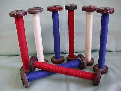 Title (ebay affiliate link): 8 VINTAGE TEXTILE WOODEN TEXTILE MILL SPOOLS, BOBBINS W/YARN