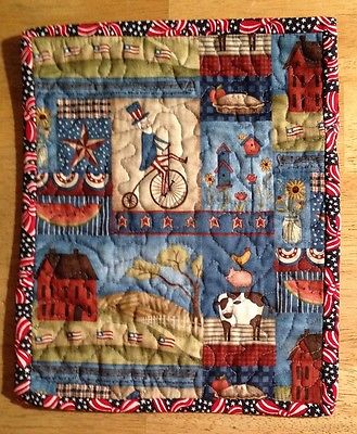 Title (ebay affiliate link): Americana Flags Uncle Sam Saltbox Stars Quilted Candle Mat Mug Rug Mini Quilt