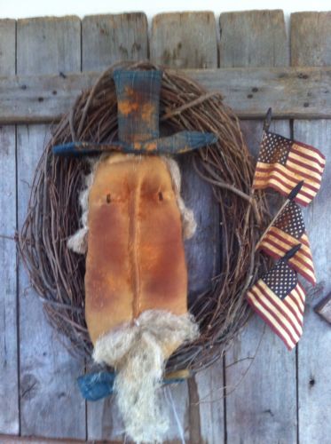 Primitive Folk ARt Americana Uncle Sam wreath 24" flags Grungy door charmer