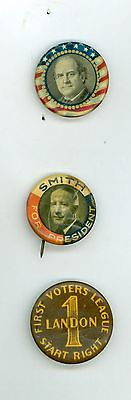 3 Vintage 1900s-1920s Presidential Political Pinback Buttons Bryan Smith Landon