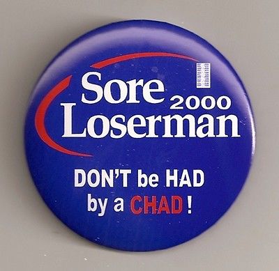 Title (ebay affiliate link): 2000 Sore Loserman President Button FLORIDA RECOUNT George Bush Al Gore CHAD