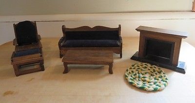 VINTAGE/ANTIQUE WOOD DOLL HOUSE FURNITURE, 6 PIECES, COUCH, CHAIR, FIREPLACE,ETC