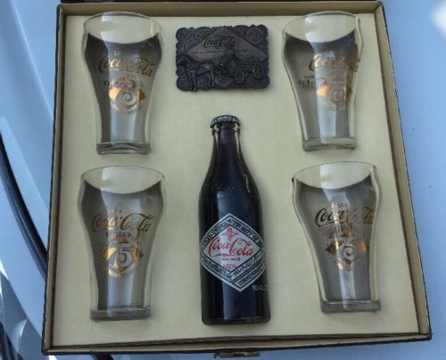 Title (ebay affiliate link): 1977 Coca-Cola Complete 75th Anniversary Box Set Bottle, Glasses, Belt Buckle