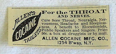 Title (ebay affiliate link): small 1885 ALLEN'S COCAINE TABLETS for throat & nerves ad
