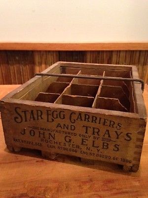 Title (ebay affiliate link): 1906 Wooden Dovetailed Star Egg Carrier & Tray - John G Elbs, Rochester NY
