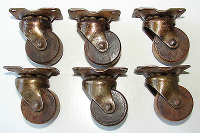 ANTIQUE VINTAGE FURNITURE FLANGED CASTERS WOODEN WHEELS GROUP OF SIX 1 1/8 "