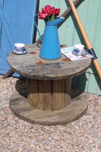 Title (ebay affiliate link): Vintage Wooden Cable Drum Industrial Coffee Table Garden Table Retro Rustic Chic