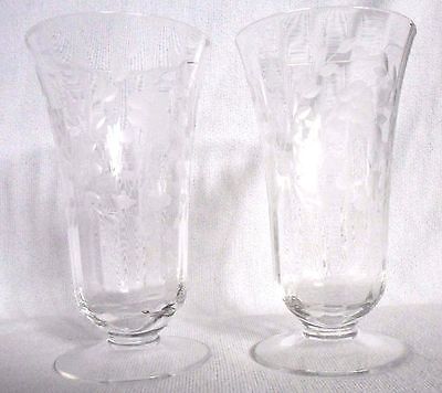 Set 2~Vtg Depression Glass Etched Floral Leaves Paneled Parfait Glasses Tumblers
