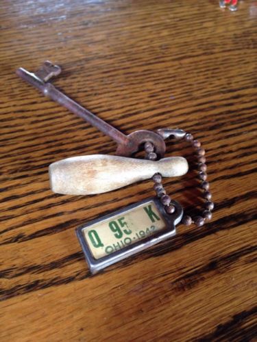 Title (ebay affiliate link): VINTAGE KEY CHAIN OHIO 1942 LICENSE PLATE AND WOOD BOWLING PIN/SKELETON KEY