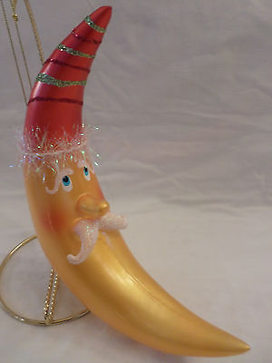 Vtg 7.5" Crescent Moon Santa Figural BLOWN GLASS Christmas ORNAMENT signed ITALY