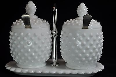 Rare Vintage Fenton Hobnail Milk Glass Jam Jelly Jar Condiment Set With Tray