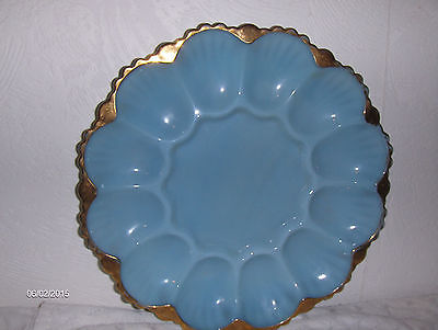 VINTAGE ANCHOR GLASS DELPHITE BLUE MILK GLASS 22K GOLD DEVILED EGG OYSTER PLATE