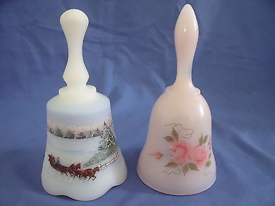 2 HAND PAINTED FENTON BELLS -SIGNED WINTER SLEIGH SCENE & PINK MILK GLASS-ROSES