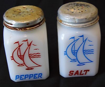 VINTAGE MILK GLASS 1940'S SALT AND PEPPER SHAKER SET - SAILBOAT