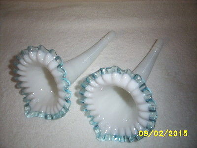 2 FENTON AQUA CREST MILK GLASS EPERGNE HORNS