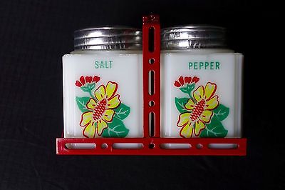 VINTAGE TIPP CITY DAISY MILK GLASS SALT & PEPPER SHAKERS WITH RACK