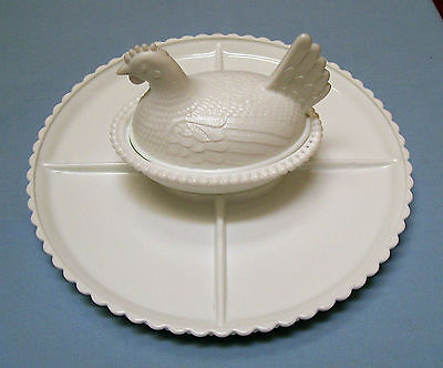 VINTAGE WHITE MILK GLASS ROOSTER BOWL ON LARGE RELISH TRAY - WOW!