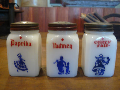 3 Vintage Tipp City Dutch Dove Milk Glass Spice Jars