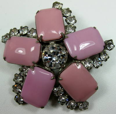 Vintage Pink Milk Glass Clear Rhinestone Brooch Pin