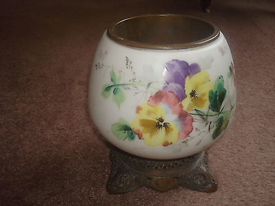 Antique 1890's Victorian Painted Pansy Flower Milk Glass Metal Oil Lamp Base