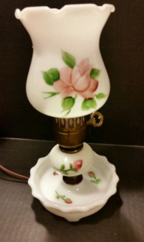 Title (ebay affiliate link): Vtg Electric Hurricane Milk Glass Bedside Lamp Hand Painted Pink Rose w/Tray