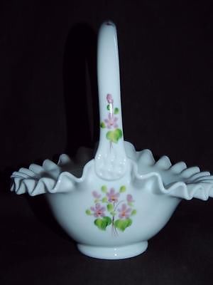 Fenton White Milk Glass Violets in the Snow Bride's Basket 8" Kim Blake Signed