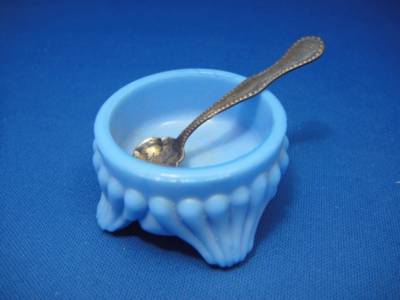 Sterling Silver Salt Spoon & Blue Milk Glass Salt Dip