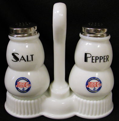 Milk Glass Salt & Pepper Shaker Set w/ Holder & Pepsi