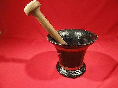 GREAT ANTIQUE IRON MORTAR AND WOODEN PESTLE-6 3/4" ARCOSS