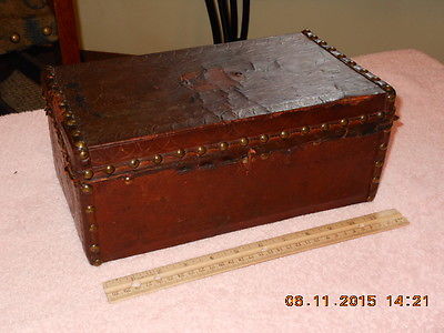 Title (ebay affiliate link): 1840's Primitive Hand Tooled Leather Covered Minature Trunk/Box Brass Hardware