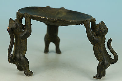 Lovely Chinese Old Bronze Carved Handwork Collect Cat Statue Oil Lamp Ornament