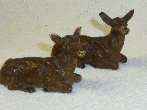 2 Antique Vintage ELASTOLIN Composition DEER Doe Figures