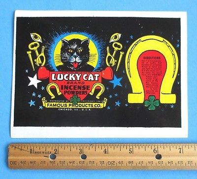 Title (ebay affiliate link): Original Vtg 1940s LUCKY CAT INCENSE POWDERS LABEL~Famous Products,Chicago,Black