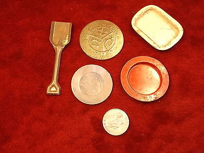 LOT OF OLD VTG CRACKER JACK TIN TOYS, GREY FLOWER DISH, PROSPECTING TOOLS, TOKEN